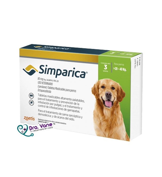 SIMPARICA 80 mg de ZOETIS es un comprimido masticable indicado para el tratamiento de infestaciones por pulgas, garrapatas y tratamiento de la sarna sarcóptica (Sarcoptes Scabiei), Sarna demodécica (Demodex Canis) y sarna Otodéctoca (Otidectes Cynotis) en perros de 20 a 40 Kg de peso. Este medicamento tiene un color marrón jaspeado con bordes redondeados y un buen sabor, para evitar el rechazo por parte de la mascota. ZOETIS® es una de las mayores empresas productoras de medicamentos y vacunas para mascotas y ganado, se basa en una historia de 6 décadas y en un singular enfoque en la salud animal para proporcionar productos para ellos y servicios de calidad para quienes los crían y cuidan.