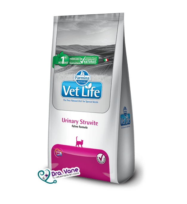 Disolución de cálculos de estruvita. Acidificación de la orina. Farmina Vet Life Struvite es un alimento dietético completo para gatos formulado para disolver los cálculos de estruvita.